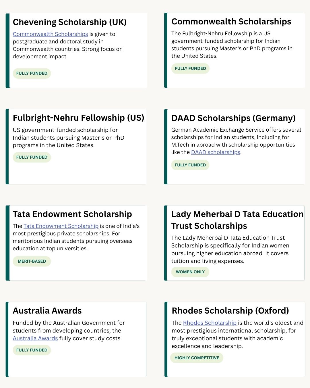 If you're specifically targeting the UK, the Great India Scholarship is one of the most sought-after awards for Indian students, covering a significant portion of tuition at participating British universities. It helps to first understand the cost of studying in the UK for Indian students before committing to a scholarship strategy.