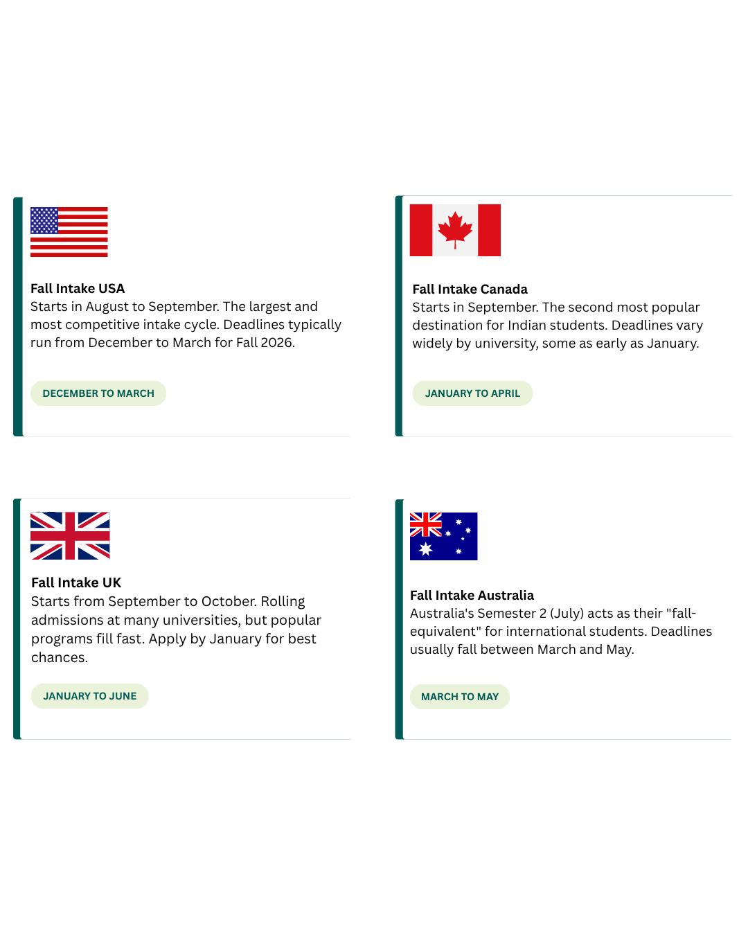 Fall intake dates and structures vary depending on the country you're targeting. Here's a quick breakdown: